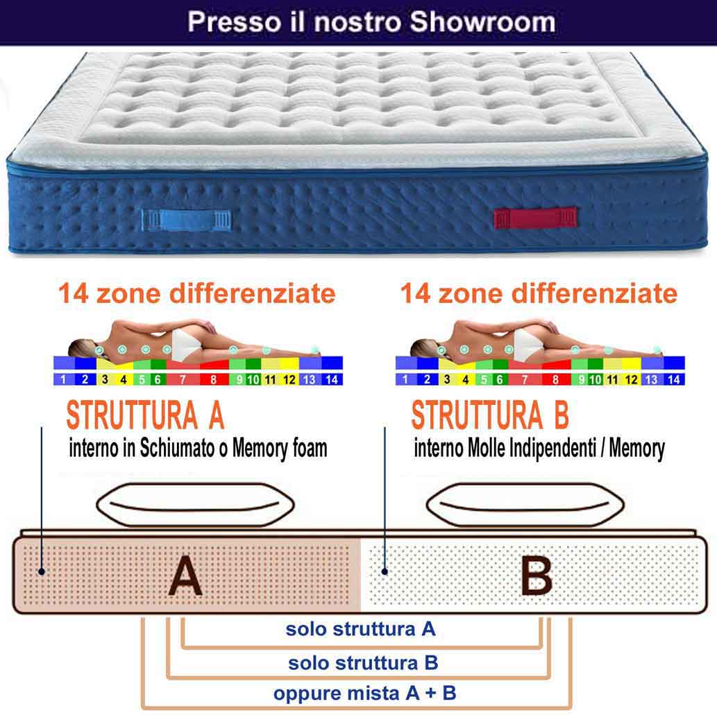 Due lati per una sola promessa: il tuo benessere. Il sistema YOU & MY si basa su un topper reversibile, integrato nella parte superiore del rivestimento, che può essere facilmente rimosso grazie a una doppia cerniera. Il pillow top offre due lati utilizzabili, pensati per adattarsi alle diverse esigenze di comfort e stagionalità. La combinazione di questi due lati permette di personalizzare il riposo in base alle proprie esigenze, semplicemente ruotando il pillow top. YOU & MY è la sintesi perfetta tra tecnologia, comfort e praticità: una soluzione intelligente, pensata per accompagnare il benessere notte dopo notte. All’interno del rivestimento YOU & MY possono trovare posto due lastre interne indipendenti, selezionabili in base alle preferenze individuali. Una volta inserite, le due anime vengono racchiuse all’interno del rivestimento YOU & MY, che le unisce in un solo corpo. Il risultato è un materasso tecnicamente doppio, ma visivamente e praticamente unico, capace di offrire massimo comfort personalizzato per entrambi i lati del letto. All’interno del rivestimento YOU E MY possono trovare posto due lastre interne indipendenti, selezionabili in base alle preferenze individuali. Una volta inserite, le due anime vengono racchiuse all’interno del rivestimento YOU E MY, che le unisce in un solo corpo. Il risultato è un materasso tecnicamente doppio, ma visivamente e praticamente unico, capace di offrire massimo comfort personalizzato per entrambi i lati del letto. L’utilizzo di materiali 100% Made in Italy e la certificazione OEKO TEX 100 garantiscono l’utilizzo di materie prime di alta qualità.